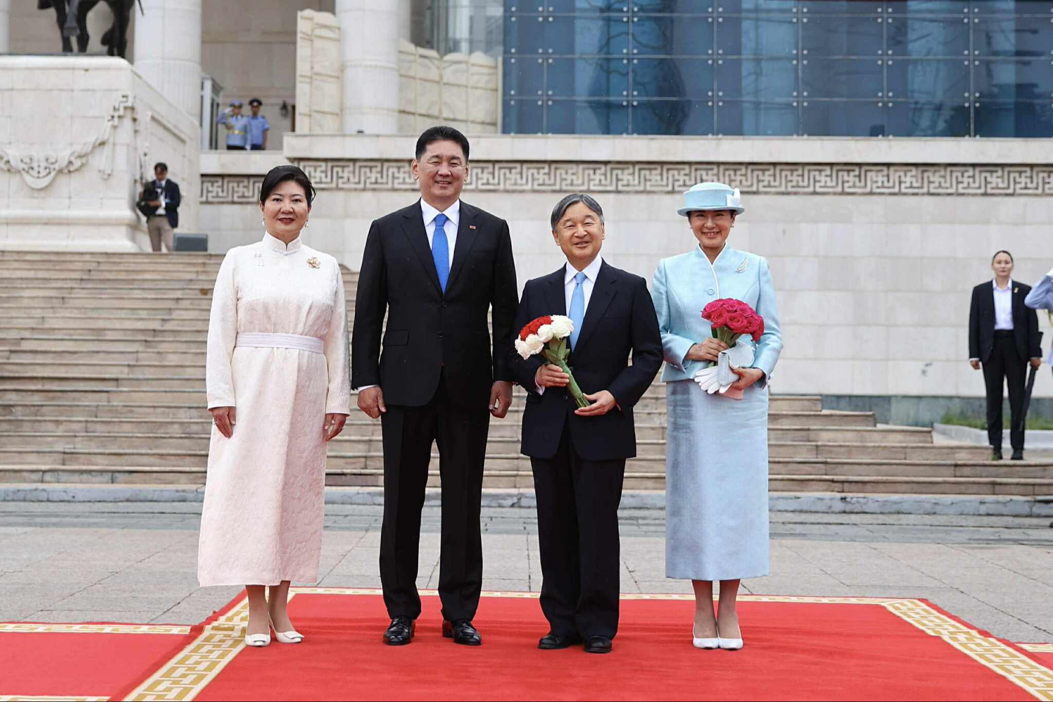 Монгол Улсын Ерөнхийлөгч Ухнаагийн Хүрэлсүх, гэргий Лувсандоржийн Болорцэцэгийн хамт Япон Улсын Цог Жавхлант Эзэн Хаан Нарүхито, Эрхэм дээд Хатан Масако нарыг Д.Сүхбаатарын талбайд албан ёсоор угтан авлаа.