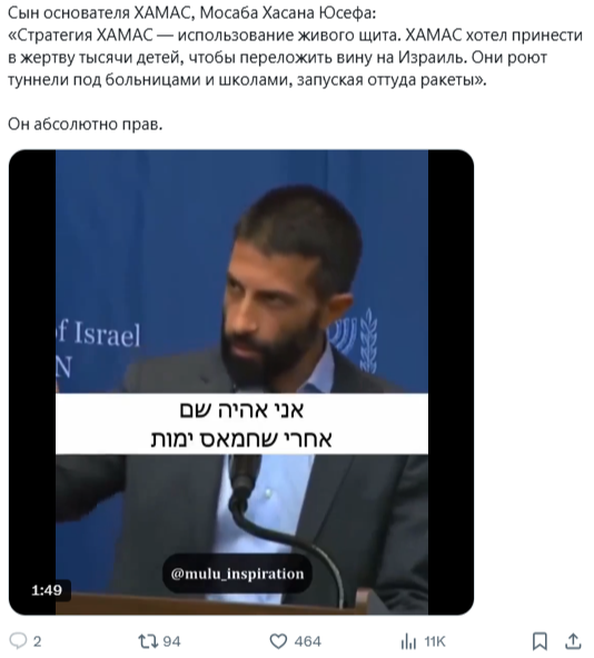 Тэгвэл энэ зураг дээр Израилийн ТВ-ийн орос сувгаар ХАМАС-ын нэг дайчин ярьж байна. ХАМАС-ын стратеги бол амьд хүнээр бамбай хийх явдал. Ялыг нь Израильд тохохын тулд мянга мянган хүүхэд хэлмэгдчихсэн байх ньХАМАС-ын хүсэл. ХАМАС нь эмнэлэг сургуулийн дор гүн хонгил ухаж тэндээс пуужингаа харвадаг гэжээ.