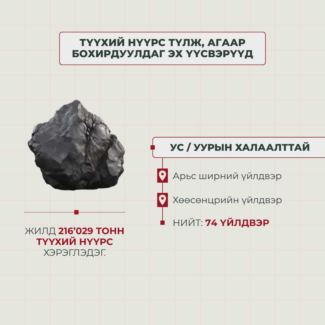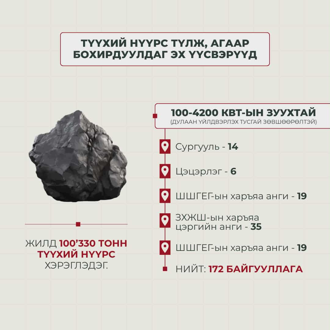 Харин Улаанбаатар хотын хэмжээн дэх нийт уурын болон усан халаалтын зуухуудад жил бүр 6.3 сая гаруй тонн түүхий нүүрс түлдэг байна.