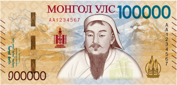 - Дэвсгэртийн нүүрэн талын голд байрлах уулын зурагны дотор MONGOLBANK, Чингис Хааны хөрөг зургийн дээлийн захын гадуур CHINGGISKHAAN гэсэн жижиг бичилттэй.