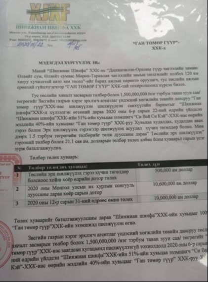 Дахиад л “Шинжиан шинфа”...Монголчуудад энэ компани хэдийнэ танил болсон байх. Юугаараа гэвэл Төрийн банкны 20 тэрбум төгрөгийг 2017 оны Ерөнхийлөгчийн сонгуулийн санал хураалтаас хэдхэн хоногийн өмнө ганцхан өдрийн дотор “Шинжиан Шинфа” компанид тавиад туучихсантай холбоотой юм. Тэрхүү зээлийг олгох үед ЗГХЭГ-ын дарга нь Ж.Мөнхбат байсан. Сангийн сайд Б.Чойжилсүрэнгийн 2017 оны зургаадугаар сарын 23-ны өдөр Төрийн банкны ерөнхий захирал Д.Баярсайханд явуулсан “Эдийн засгийг идэвхжүүлэх, бүтээн байгуулалтыг нэмэгдүүлэх, төр, хувийн хэвшлийн түншлэлийг өргөжүүлэх зорилгоор Монгол Улсын Засгийн газартай гэрээ байгуулсан хуулийн этгээдийн санхүүгийн үр ашигтай концессын төслийн 20 тэрбум төгрөг хүртэлх санхүүжилтийн хүсэлтийг Сангийн сайдаас Төрийн банкинд хүргүүлсэн 2016 оны 11 дүгээр сарын 3-ны өдрийн 7-1/6647 дугаар албан бичгээр тогтоосон зээлийн хязгаарлалтад хамааруулахгүйгээр холбогдох дүрэм, журамд нийцүүлэн судлан үзэхийг зөвшөөрч байна” гэсэн бичиг зэргийг Төрийн банкны ажилтнууд эсэргүүцээд дийлнэ гэж үү.