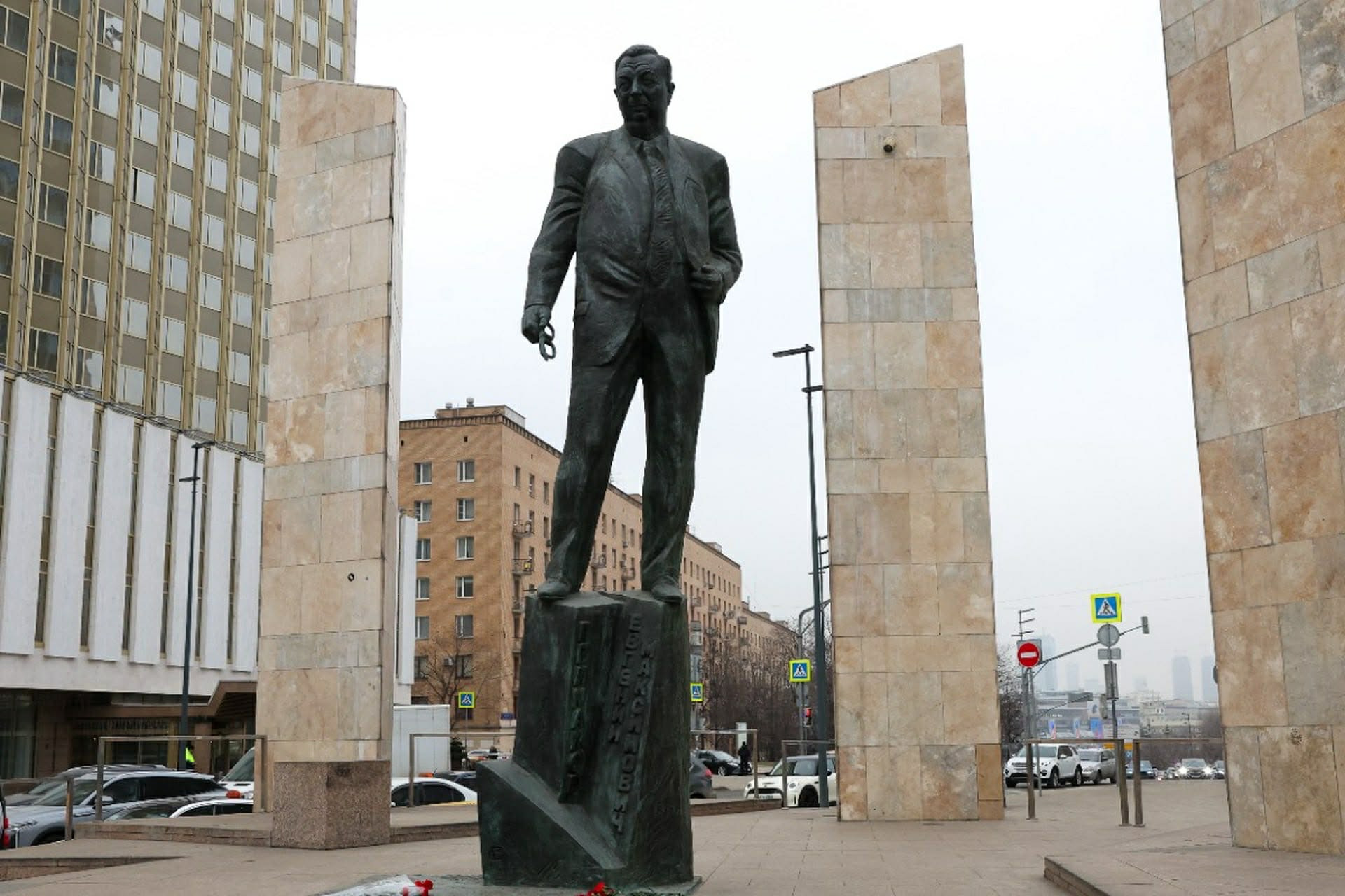 Смоленская-Сенная талбайн хөшөө төв царайтай. Зулай, мөрийг нь нөмрөн будрах цасны цагаан өнгө студийн гэрэлтүүлгээр зурж тодруулсан мэт сэтгэгдэлтөрүүлнэ. Баруун гартаа нүдний шилээ барьж, зүүн гараараа хүрэмнийхээ энгэрийг бага зэрэг ярж атгасан Примаков Гадаад хэргийн яамны зүг духайсхийн ширтэнэ. Гадаад хэргийн яамыг “Де Факто” ток шоуны хөтлөгч Д.Жаргалсайхан “Лавровын байшин” хэмээн нэрлэсэн юм. Энэ байшин бол “Сталины долоон өндөр” буюу “Сталинские высоткы” гэж нэрлэгддэг Москвагийн нүүр царай болсон шовх оройтой өндөр, сүрлэг барилгуудын нэг. Эдгээрийн хамгийн өндөр нь Москвагийн Улсын Их сургууль бөгөөд Дэлхийн хоёрдугаар дайны төлбөрөөр босгосон гэлцдэг.