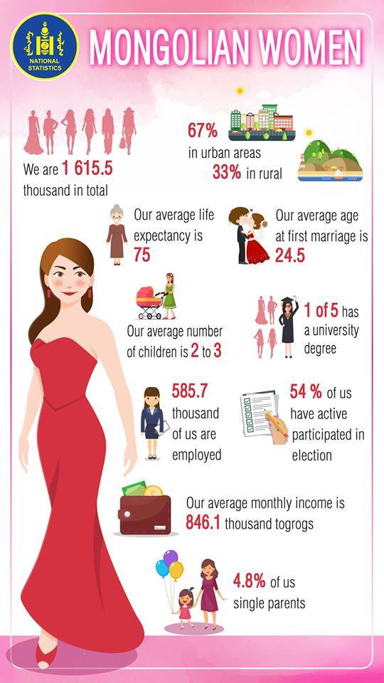 Үндэсний статистикийн хорооноос Монгол Улсын эмэгтэйчүүдийн талаарх зарим тоон мэдээллийг инфографикаар гаргасан байна.