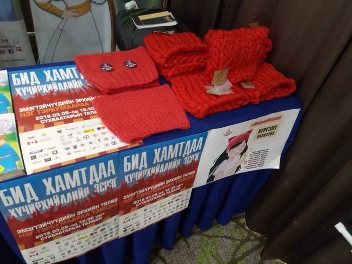 Уг жагсаалд оролцогсод улаан өнгийн малгайгаар ижилсэнэ.